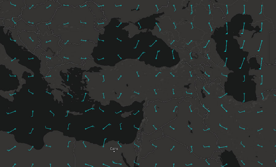 Evet, uygulamalar üzerinden rüzgarın yönü ve hızına dair yukarıdaki bilgilere benzer bilgiler paylaşılırken çeşitli özelleştirilmiş simgelere (wind barb) denk gelmeniz çok mümkün. Örneğin, aşağıdaki görüntü bugüne dair detayları göstermekte.